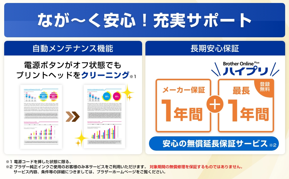 ●メーカー保証1年に加えて、2年間に1回使える延長保証の無償修理サービス「ハイプリ」が利用可能 ※要登録。※詳細はブラザーHPをご参照ください