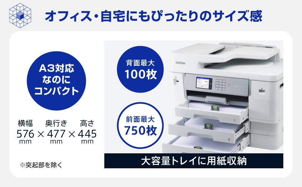 | 給紙容量 | 給紙トレイ:3段/ 各最大250枚(A3まで)。多目的トレイ:最大100枚(A3まで)。 |